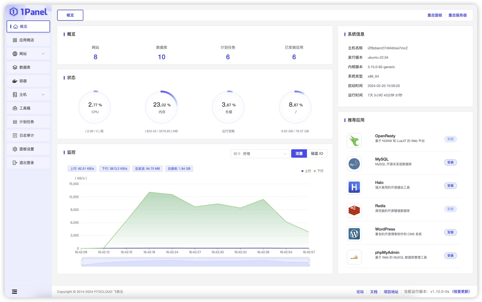 用户可以通过 Web 图形界面轻松管理 Linux 服务器,实现主机监控、文件管理、数据库管理、容器管理等功能。快速建站