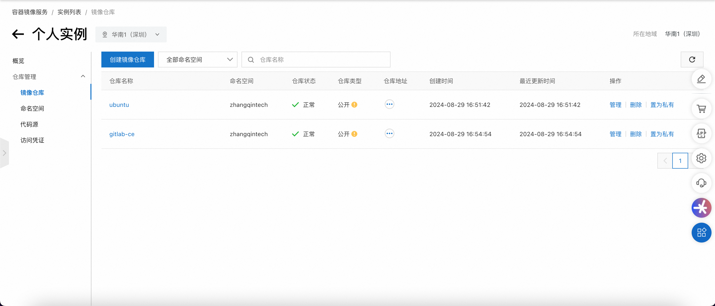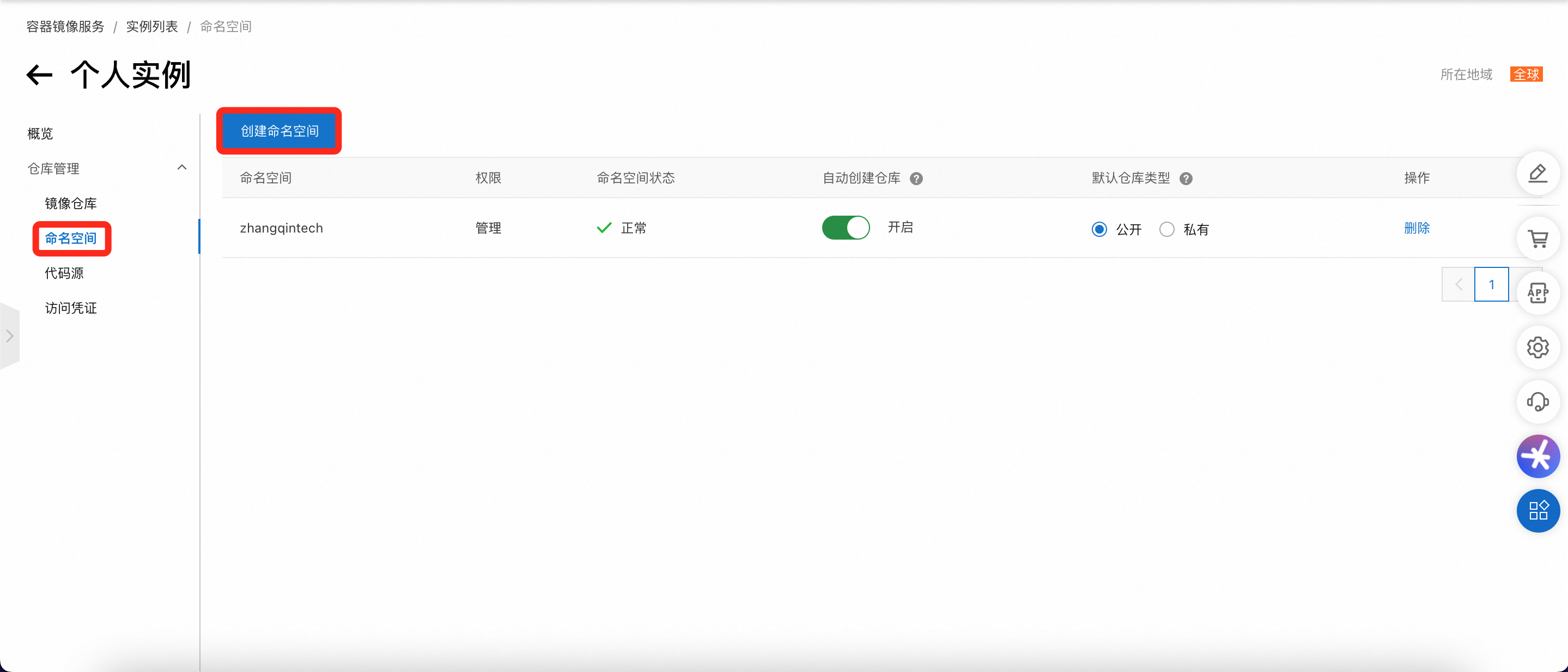 登录阿里云容器镜像服务,启用个人实例,并创建一个命名空间(ALIYUN_NAME_SPACE),为了方便我这里将命名空间设置为了公开。