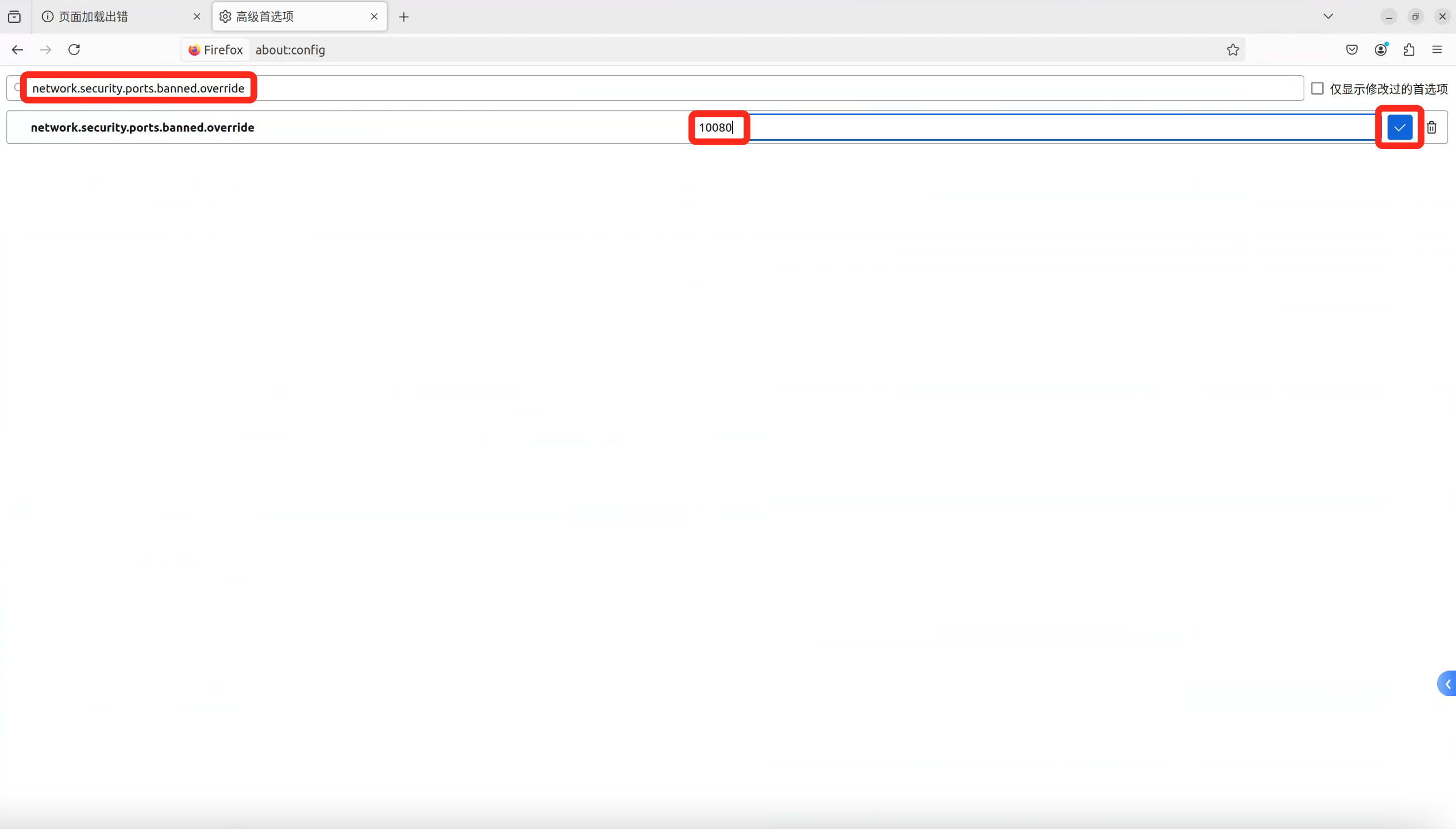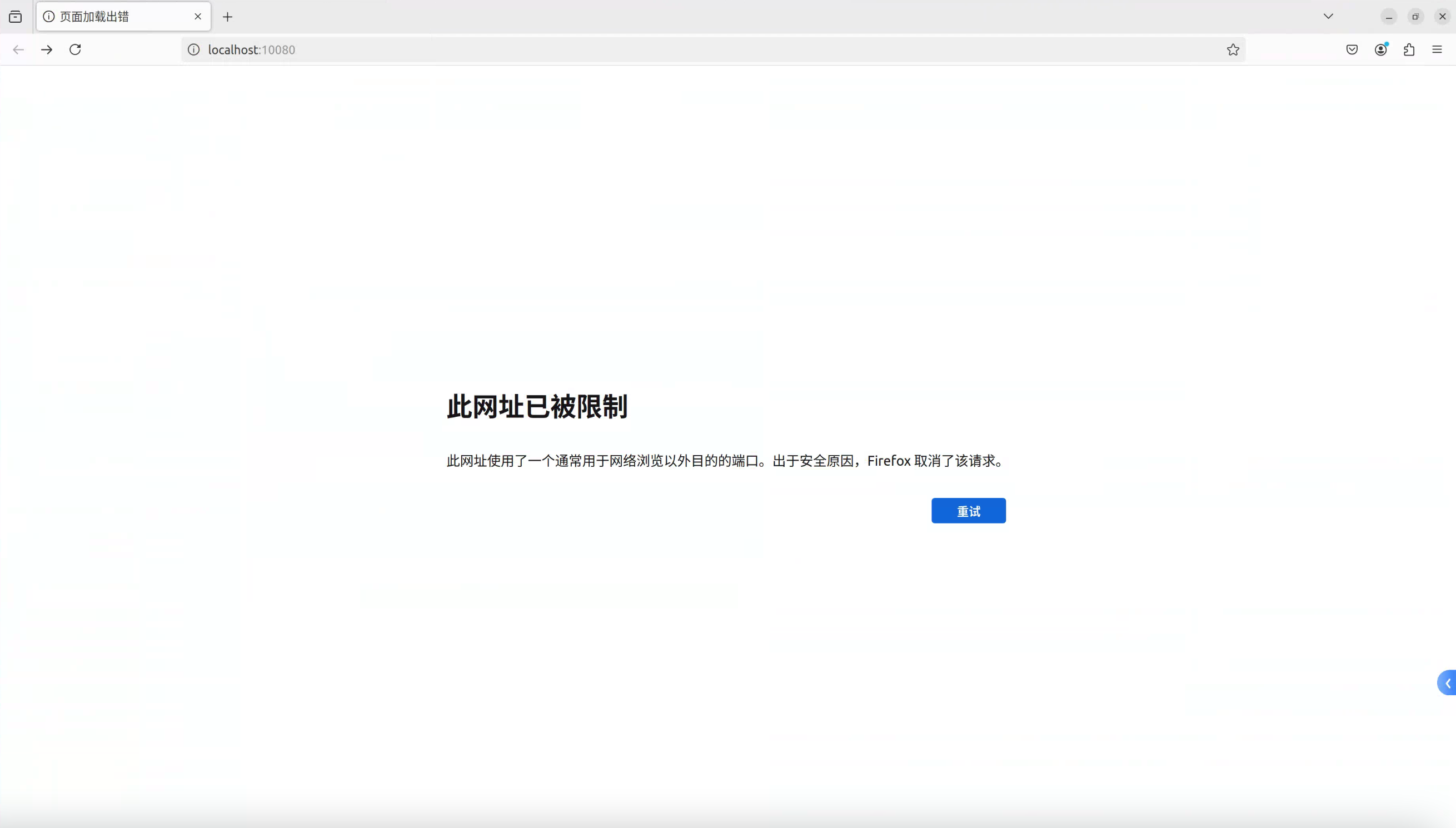 在 Ubuntu 上使用 Firefox 浏览器访问本地服务时,提示:“此网址已被限制。此网址使用了一个通常用于网络浏览以外目的的端口。出于安全原因,Firefox 取消了该请求。”。如图所示: