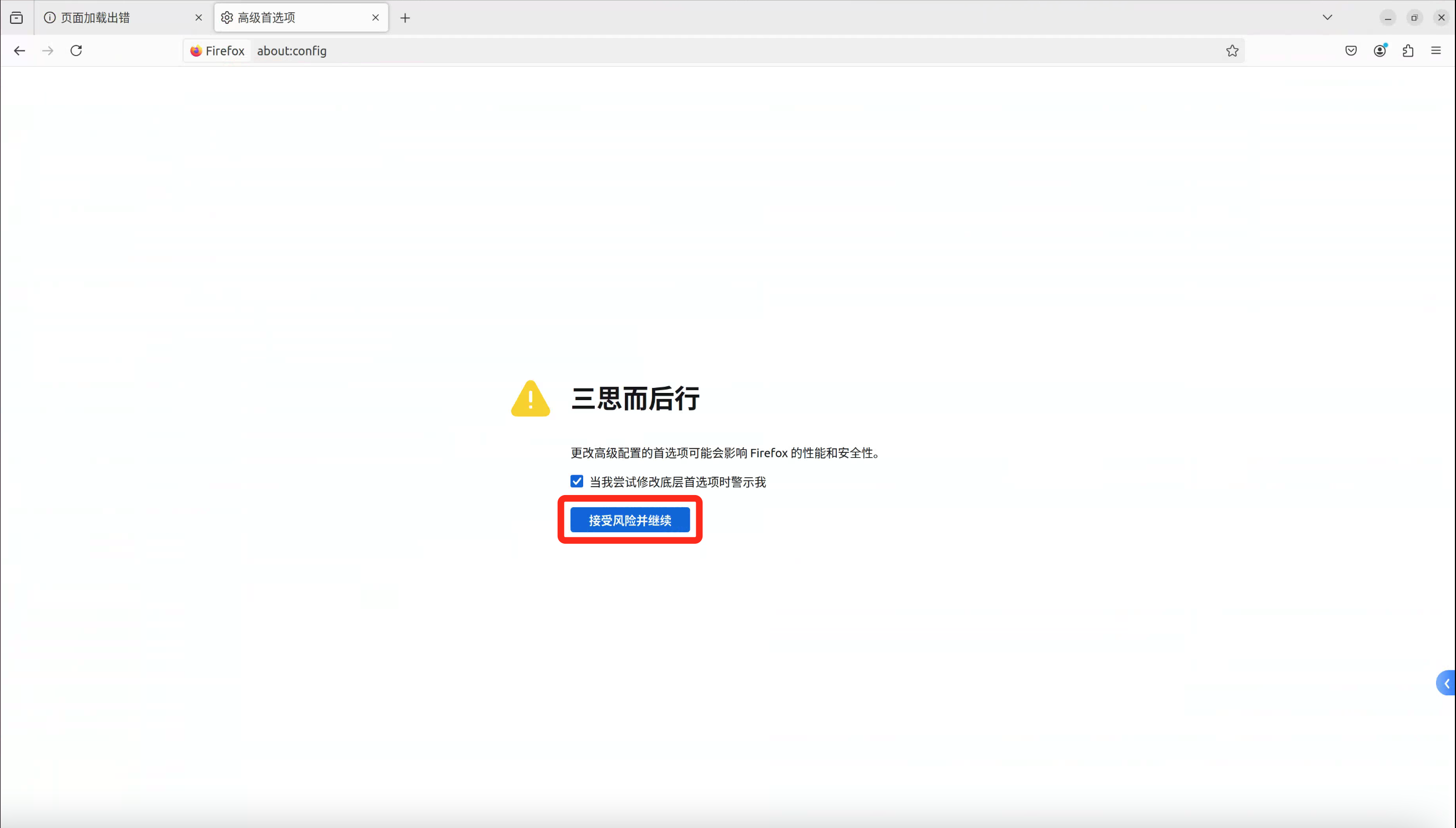 在 Firefox 地址栏输入 about:config, 点击 “接受风险并继续”,进入配置页面。