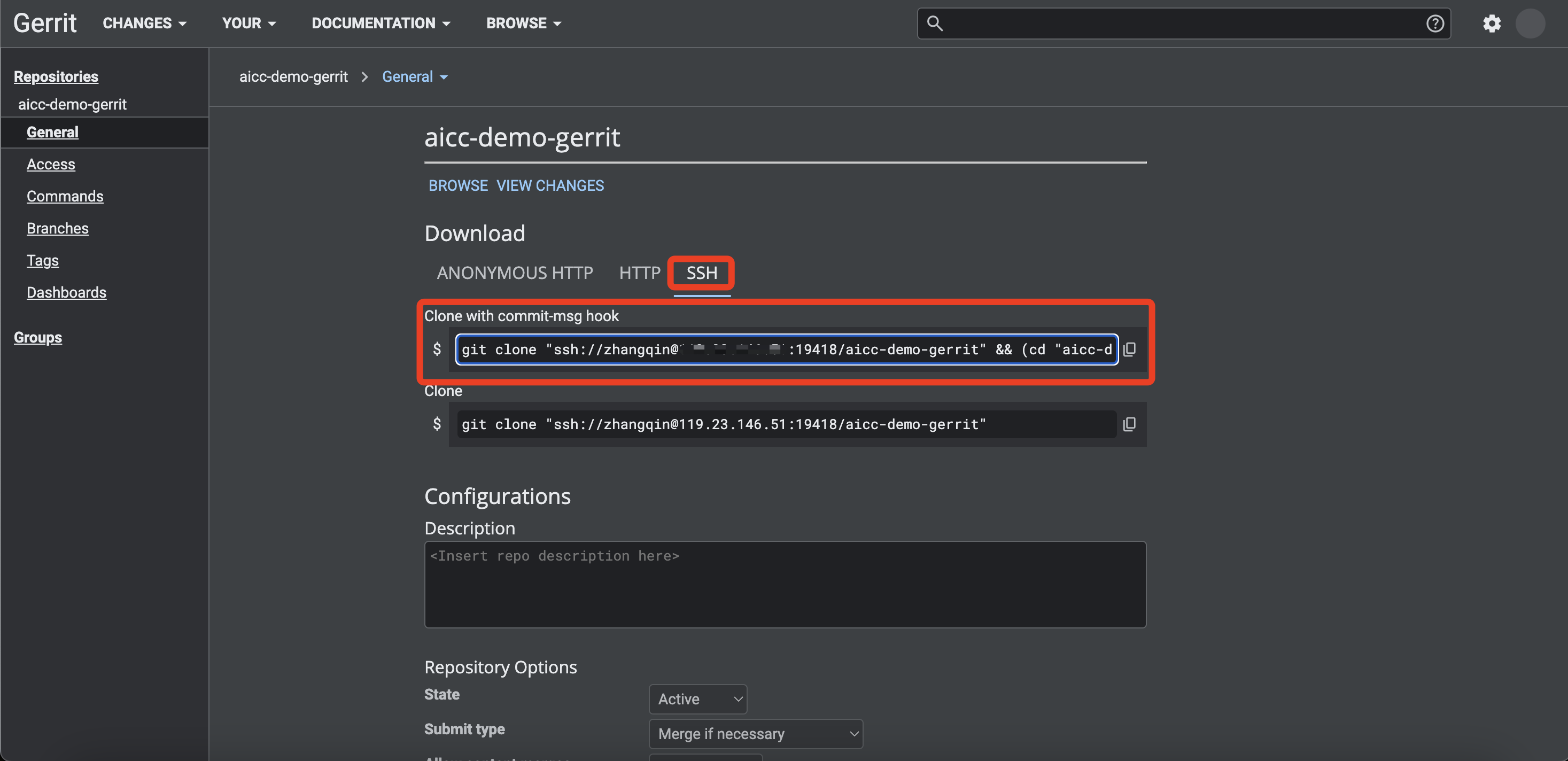 $ git clone "ssh://zhangqin@xx.xx.xx.xx:19418/aicc-demo-gerrit" && (cd "aicc-demo-gerrit" && mkdir -p `git rev-parse --git-dir`/hooks/ && curl -Lo `git rev-parse --git-dir`/hooks/commit-msg http://xx.xx.xx.xx:18018/tools/hooks/commit-msg && chmod +x `git rev-parse --git-dir`/hooks/commit-msg)