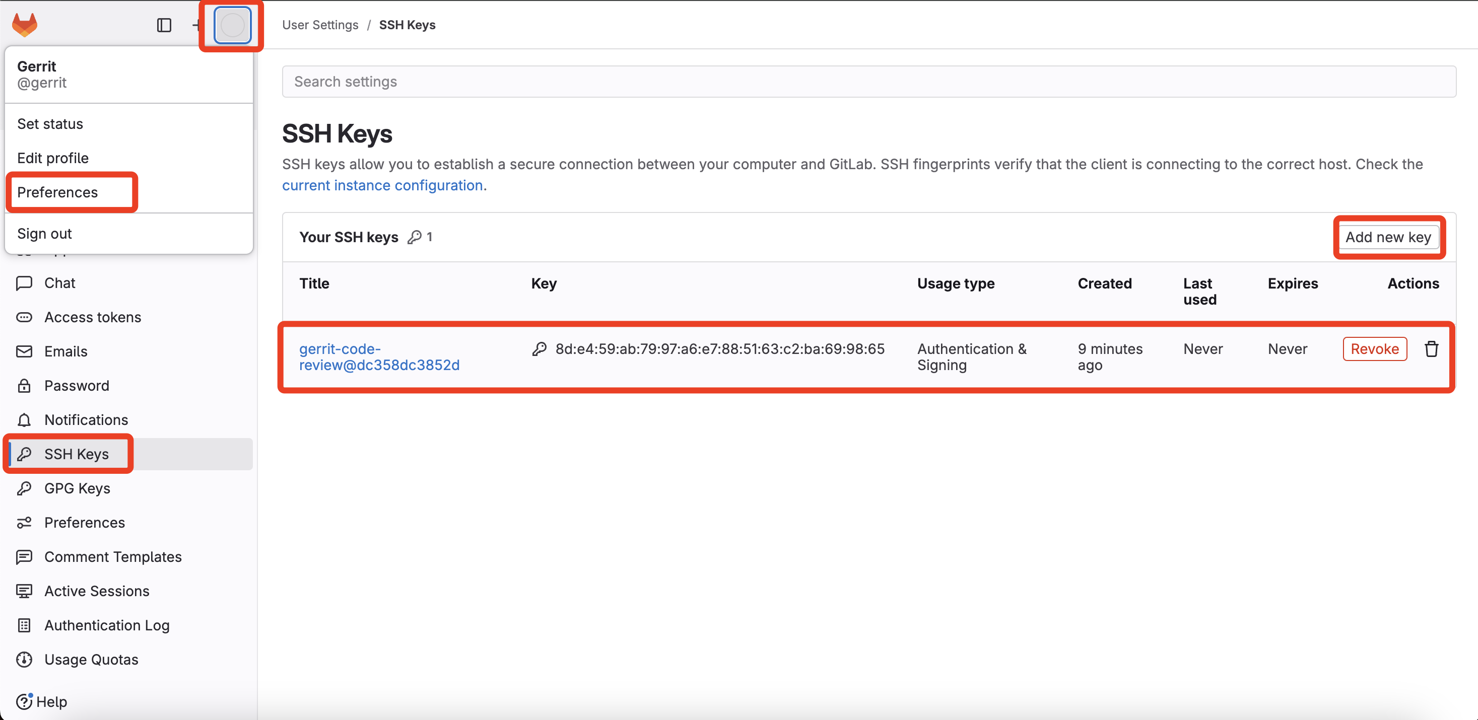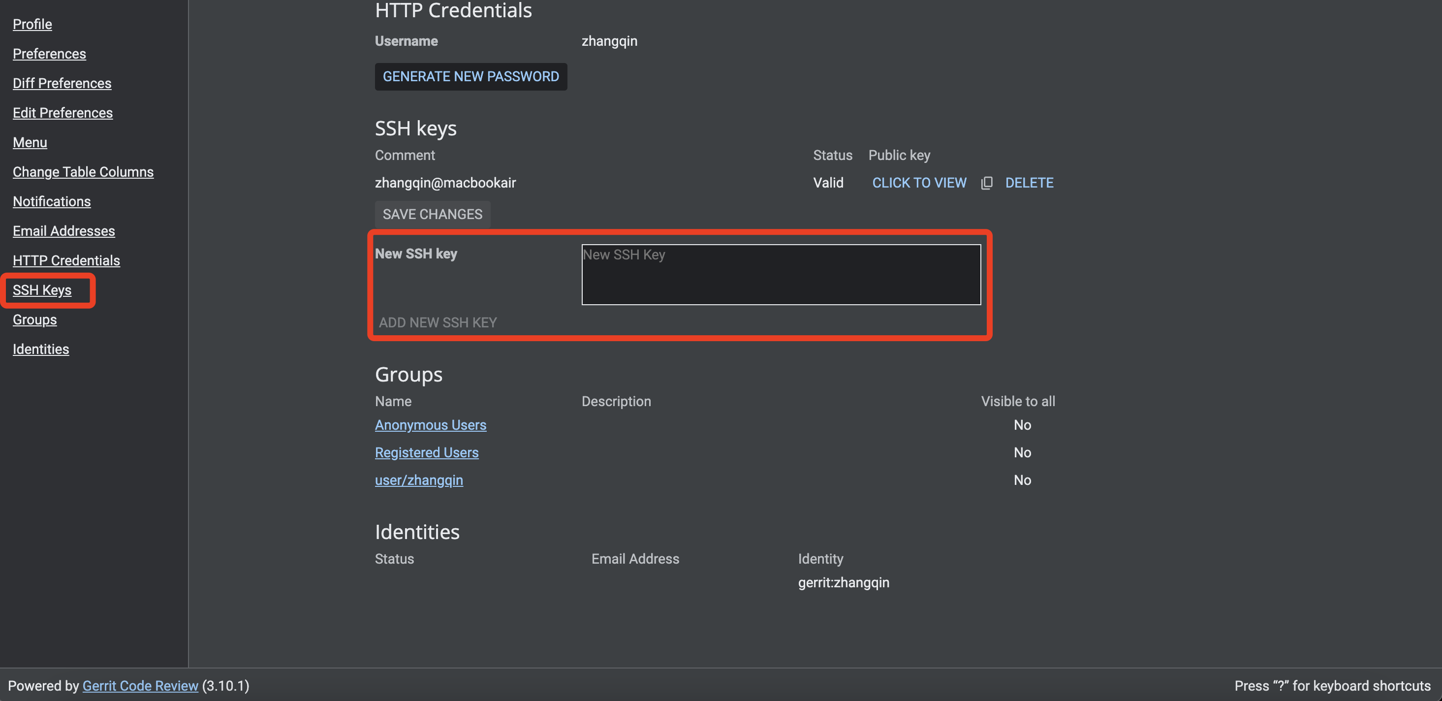 用个人账号登录Gerrit,将SSH公钥添加到到Gerrit中。
