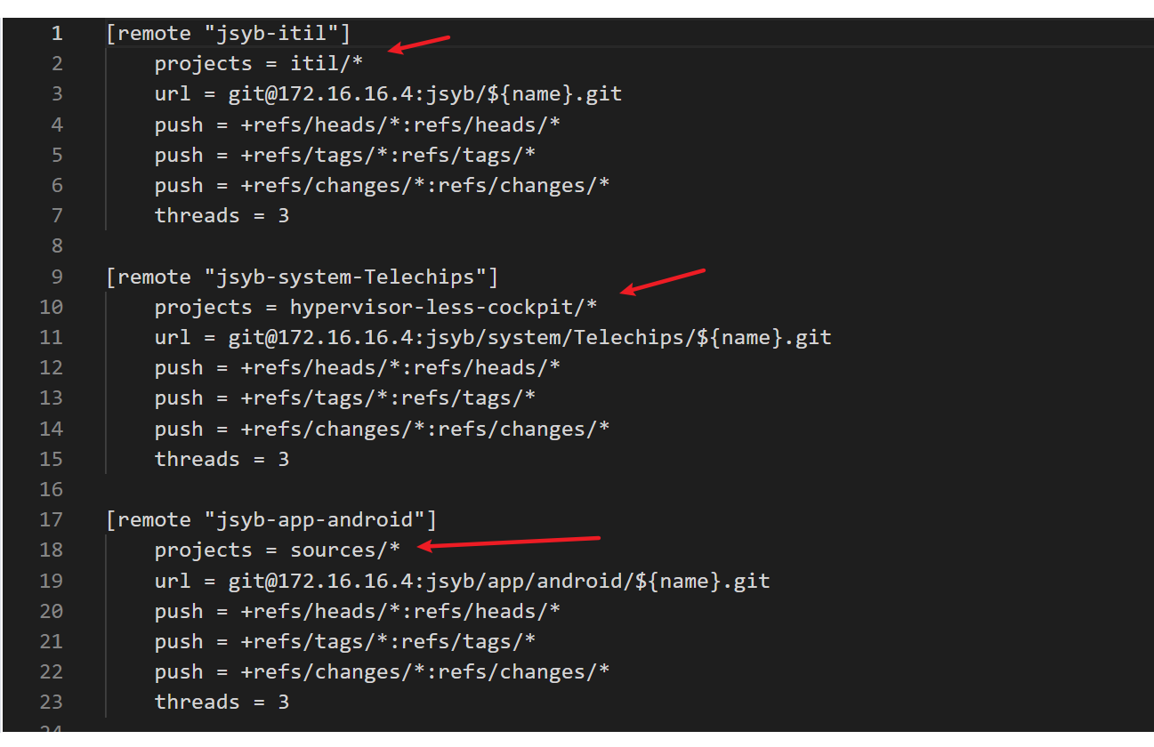url : url = git@172.16.16.4:jsyb/${name}.git:指定了远程仓库的 SSH URL。${name}是gerrit系统默认的变量,也就是项目名称。同步时${name} 替换对应的项目名称。