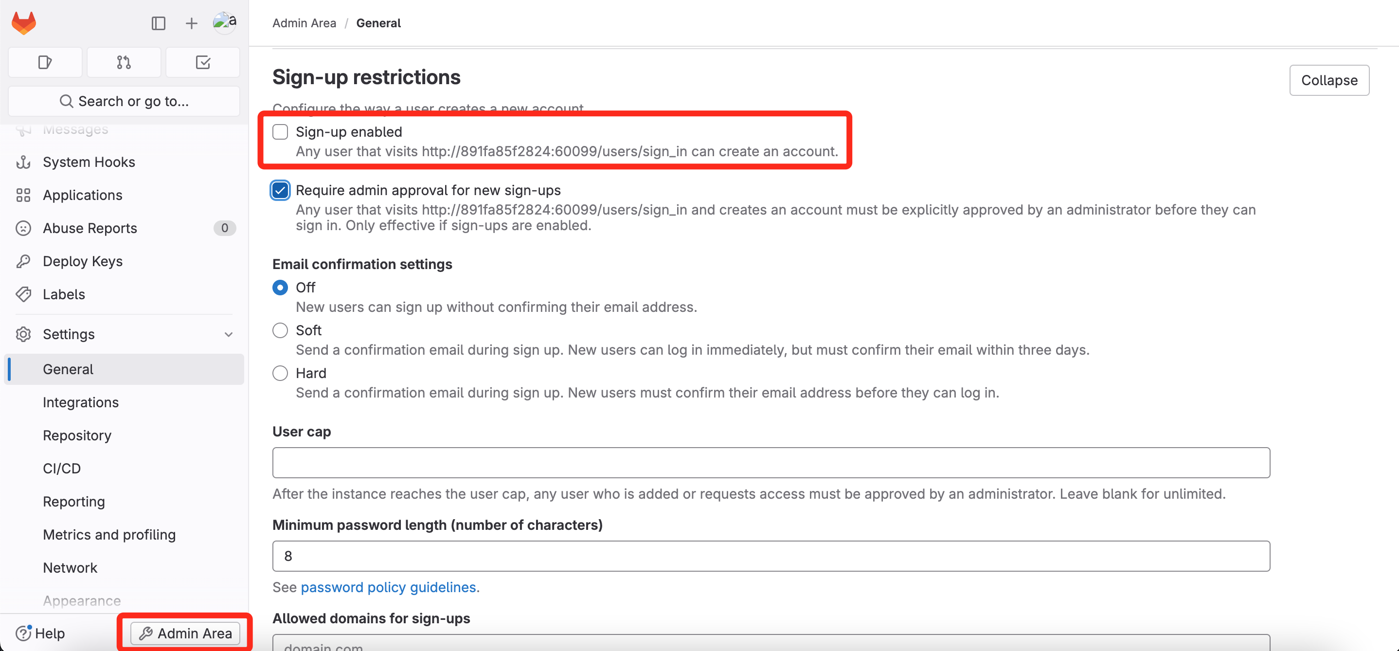 因为 Gitlab 默认开启了用户注册(需要管理员审核),建议关闭用户注册功能。记得取消勾选了Sign-up enabled,下拉点击保存按钮~~~