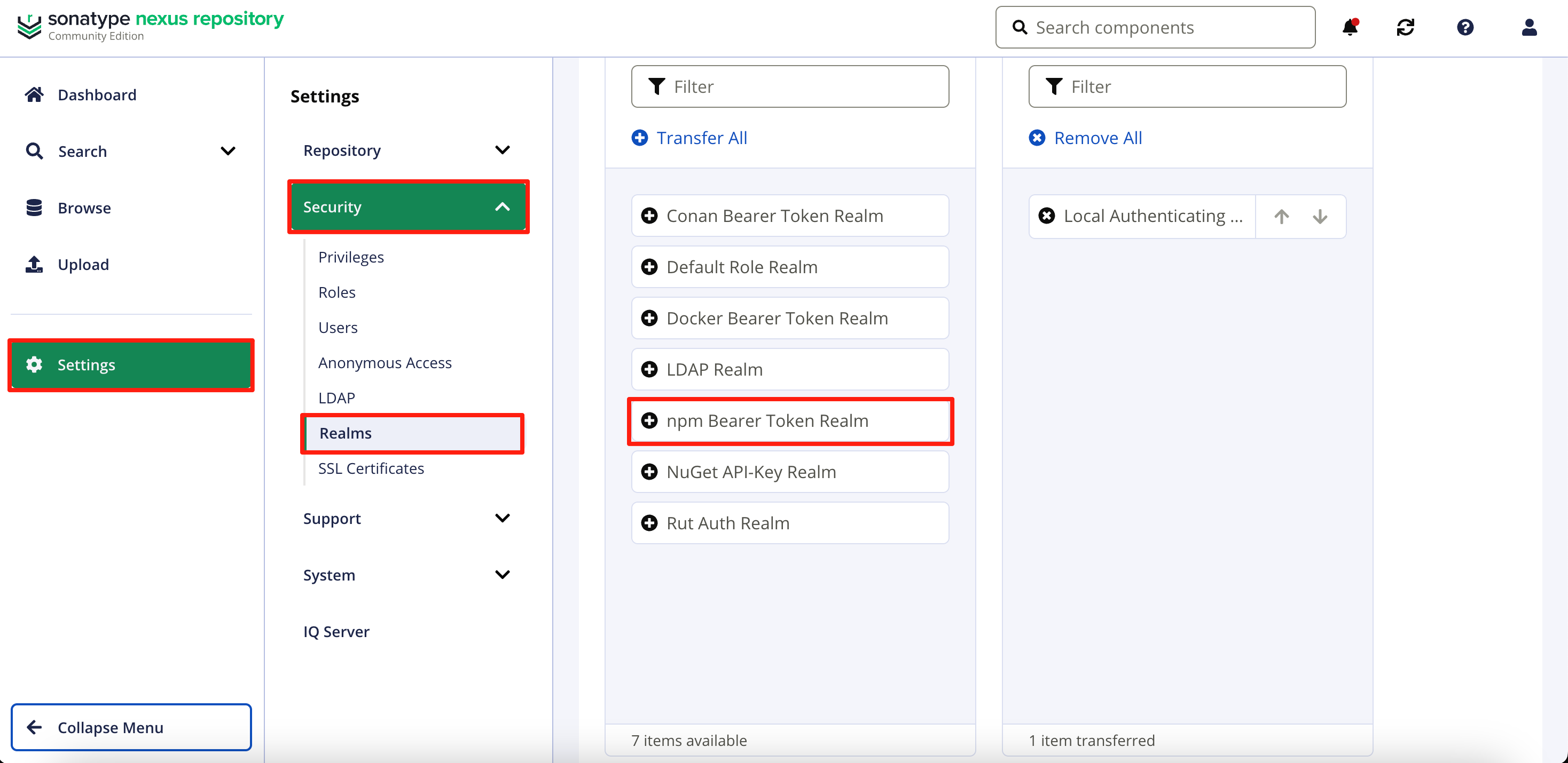 将 npm Bearer Token Realm 添加到 Active。
